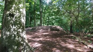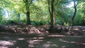 Relieved to be back in the shade, we carried on down a dusty path to the other lodge, at the Black Woods end of Childwall Woods. It’s less than a ruin now, but we learnt how the path – big enough for horses and people but not for carriages – ran through the middle of the lodge, which presumably acted as a gateway to the hall. Whilst the lodge is marked on a map from 1904 and the Home Guard are recorded as using it for shooting practice during World War II, so it was clearly still standing (in some form) then, Brenda tells us that the FCWF can find no record of what eventually happened to it.