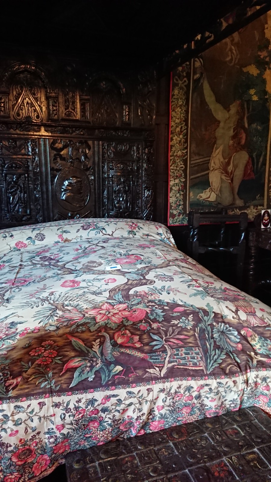 This ageing fossil then took herself upstairs, to have a look at the bedrooms. The main bedroom continues the ‘claustrophobically dark oak everywhere’ theme, with a heavy maroon counterpane on the four-poster bed adding to the Gothic feel. The two smaller bedrooms were slightly cheerier, with large tapestries and paintings alleviating the gloom somewhat, although the attendant in the bedroom that also contained a crib took great relish in telling the (apocryphal) tale of a mother hurling her baby out of the window… I moved on quickly, peering briefly through the spy hole, and into the final bedroom, its colourful counterpane a cheery counterbalance to what had gone before.