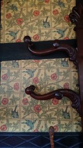 Leaving this room, I admire the wallpaper along the hallway, before reaching the Great Hall, with its striking portrait of the Childe of Hale, whom we have already come across in this blog. The painting is massive – a fitting tribute to the giant Childe.